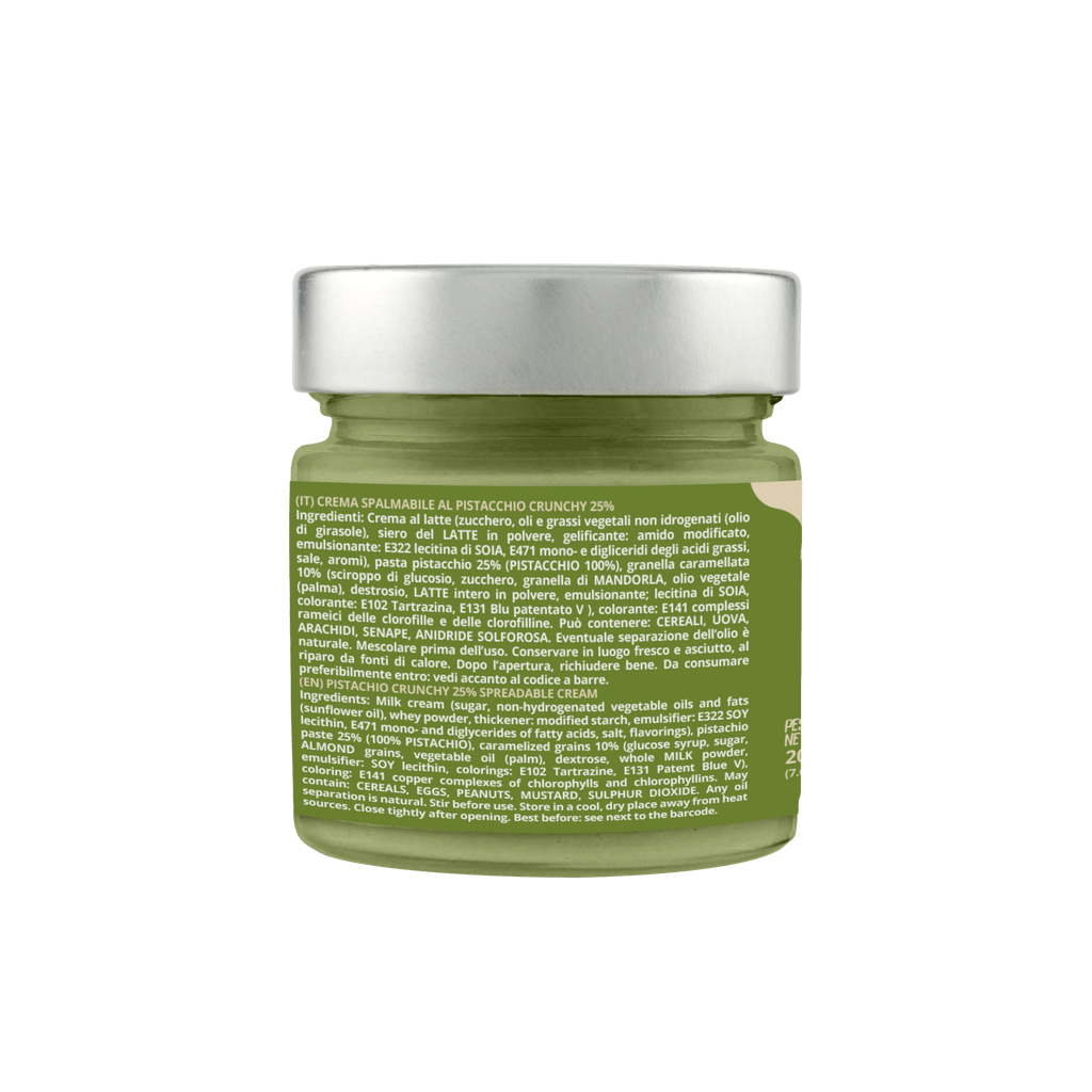 INGREDIENTS: Milk cream 75% (sugar, non-hydrogenated vegetable oils and fats (sunflower oil), whey powder, gelling agent: modified starch, emulsifier: E322 soy lecithin, E471, flavorings), PISTACHIO paste 25% (PISTACHIO 100%, salt.