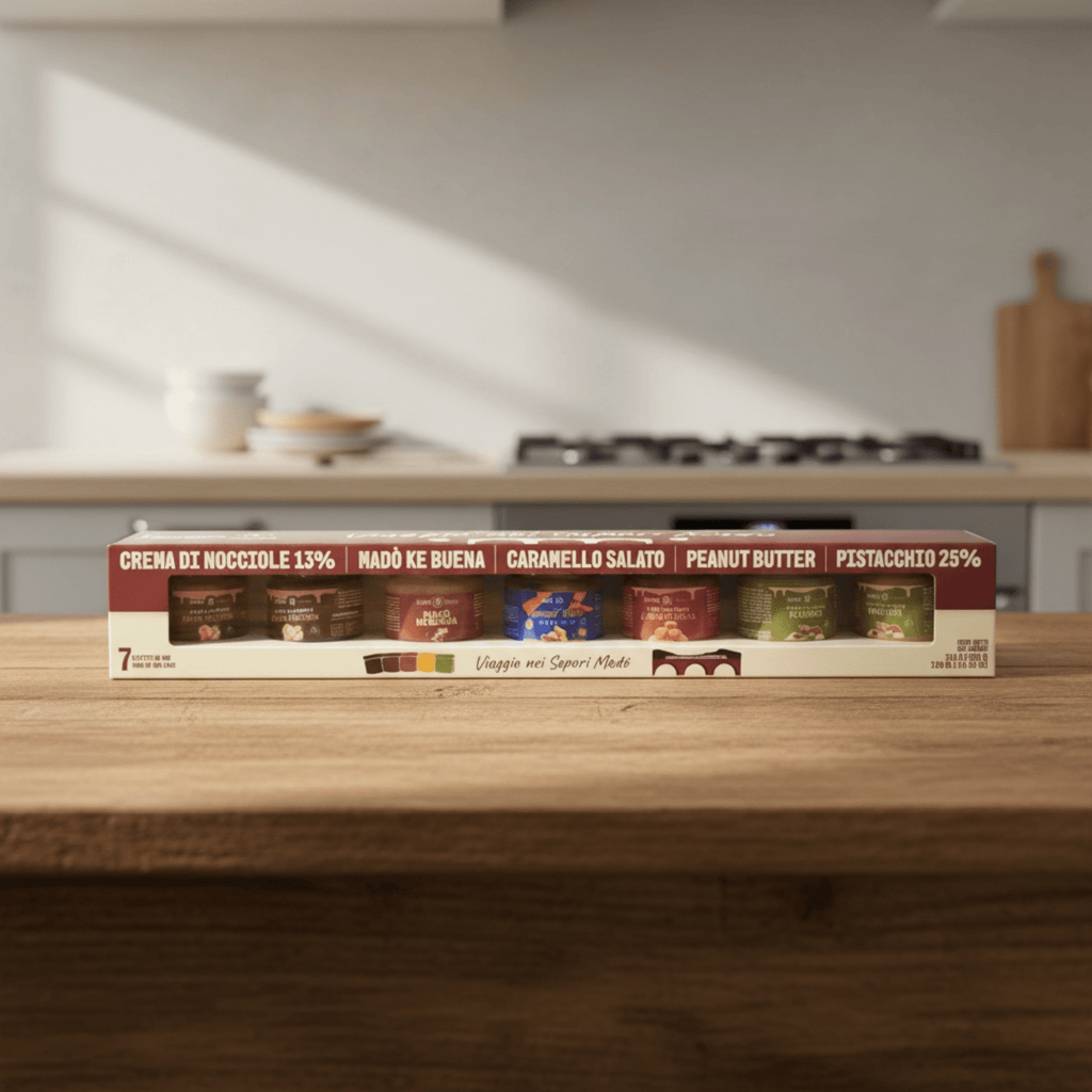 Un percorso di gusto racchiuso in 7 mini vasetti: il Viaggio Madò è una degustazione pensata per scoprire le nostre creme più iconiche in un unico kit. Un’esperienza che attraversa consistenze, intensità e profili aromatici diversi, ideale per chi vuole assaggiare, regalare o lasciarsi sorprendere.