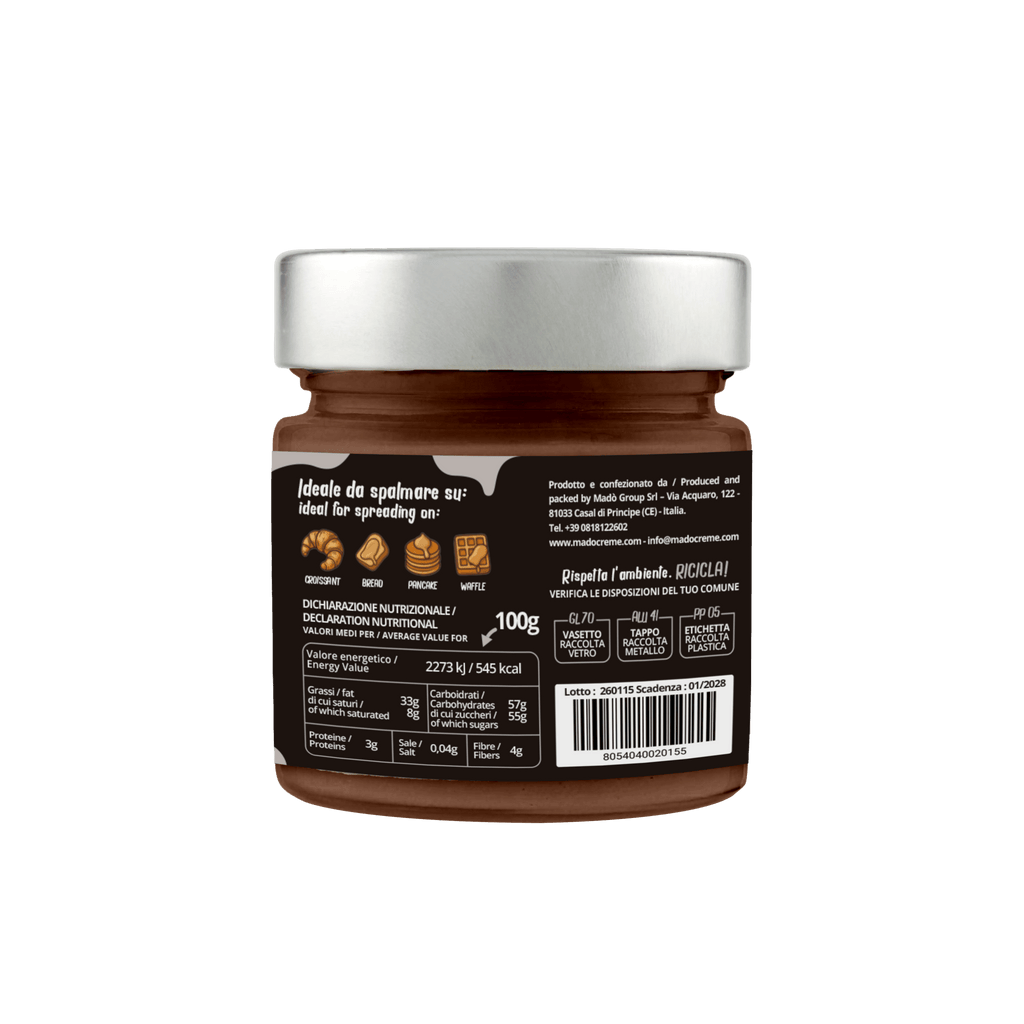 Descrizione: Un delizioso vasetto di crema al gusto CIOCCOLATO FONDENTE, perfetto per arricchire ogni spuntino o fine pasto. Pronta all'uso e facile da spalmare, è un MUST per gli amanti dei gusti intensi, con un sapore artigianale unico e irresistibile!